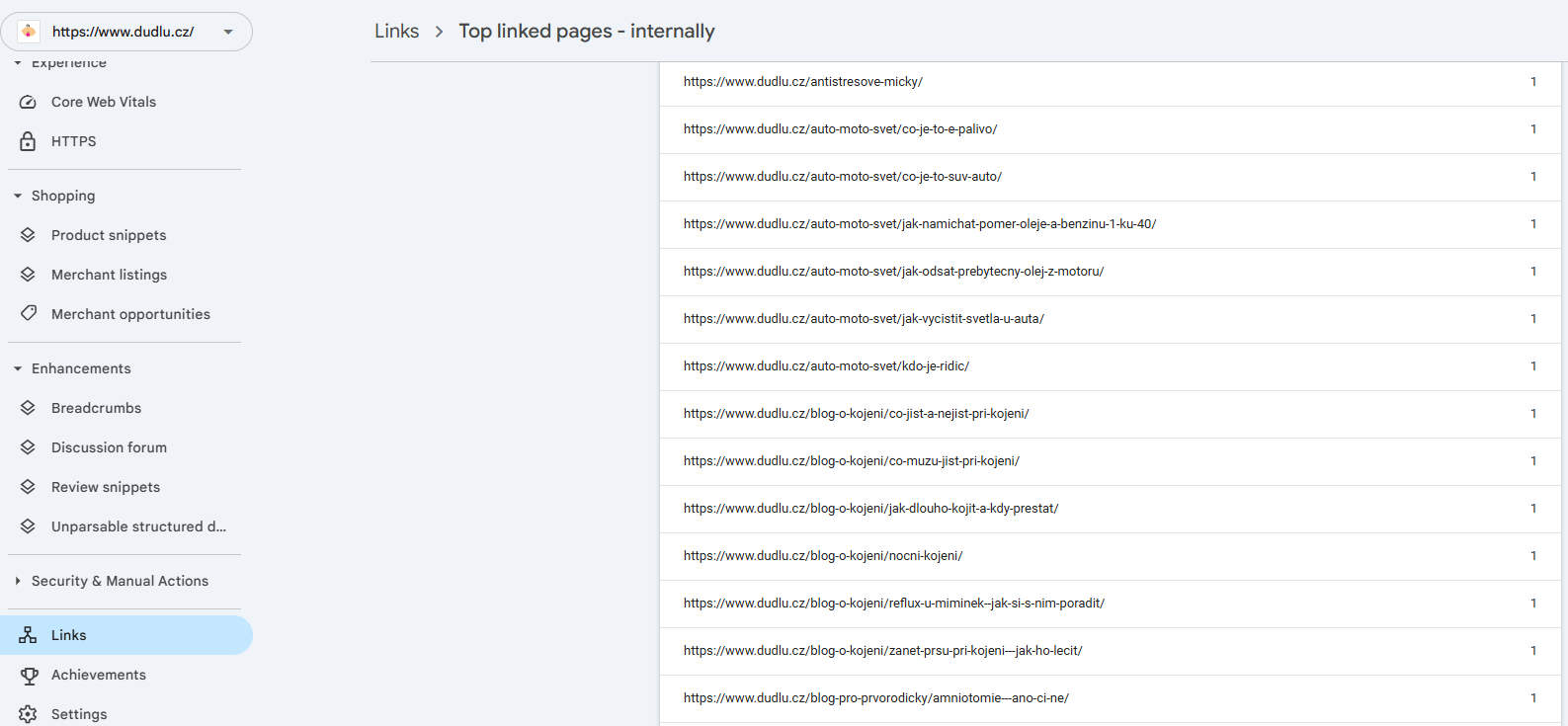 LinkJuice nelze změřit jedním číslem, ale existuje několik způsobů, jak zjistit, jestli interní odkazy fungují a stránky nejsou izolované tzv. Orphan pages. Nejjednodušší řešení zdarma je využít Google Search Console – v části Odkazy (Links) → Interní odkazy (Internal links).