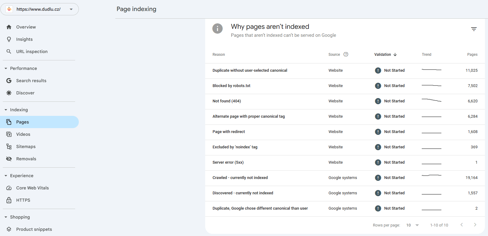 Ukázka osamocených stránek v GSC (Zdroj: vlastní e-shop Dudlu.cz)