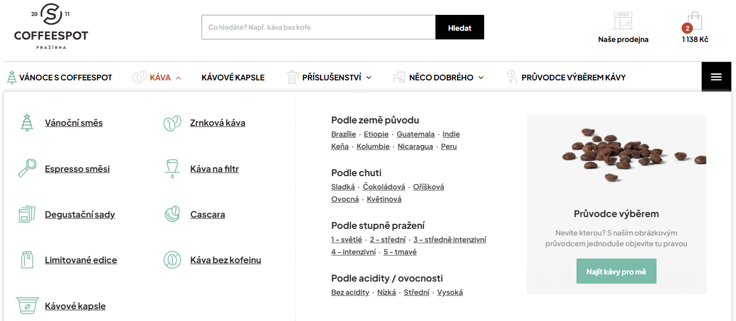 Ukázka kombinace SEO a UX drop-down menu na míru pro kategorii Káva (Klient: COFFEESPOT | UX: Lukáš Dubina)