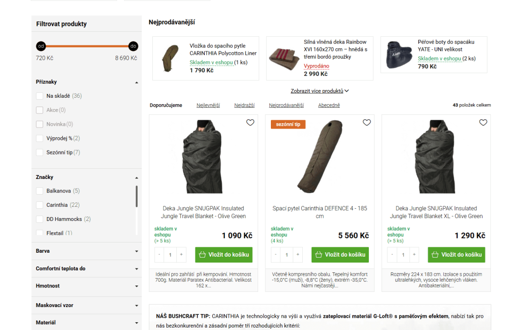 Ukázka UX úpravy kategorie na spacáky (Klient: Bushcraftshop)