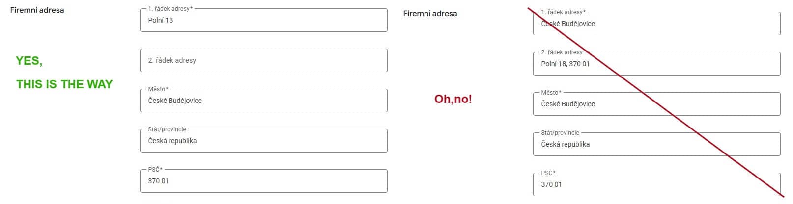 Poslední problém nevznikl na webu klienta, ale přímo v Merchant Center. Klient měl na e-shopu všechno správně, ale při zakládání účtu vyplnil firemní adresu špatně. Do prvního řádku napsal město a do druhého řádku celou adresu. Jenže první řádek má obsahovat ulici a číslo, další řádek se většinou používá jen pro doplňující informace, město patří do pole město, PSČ do pole PSČ a stát do pole stát.