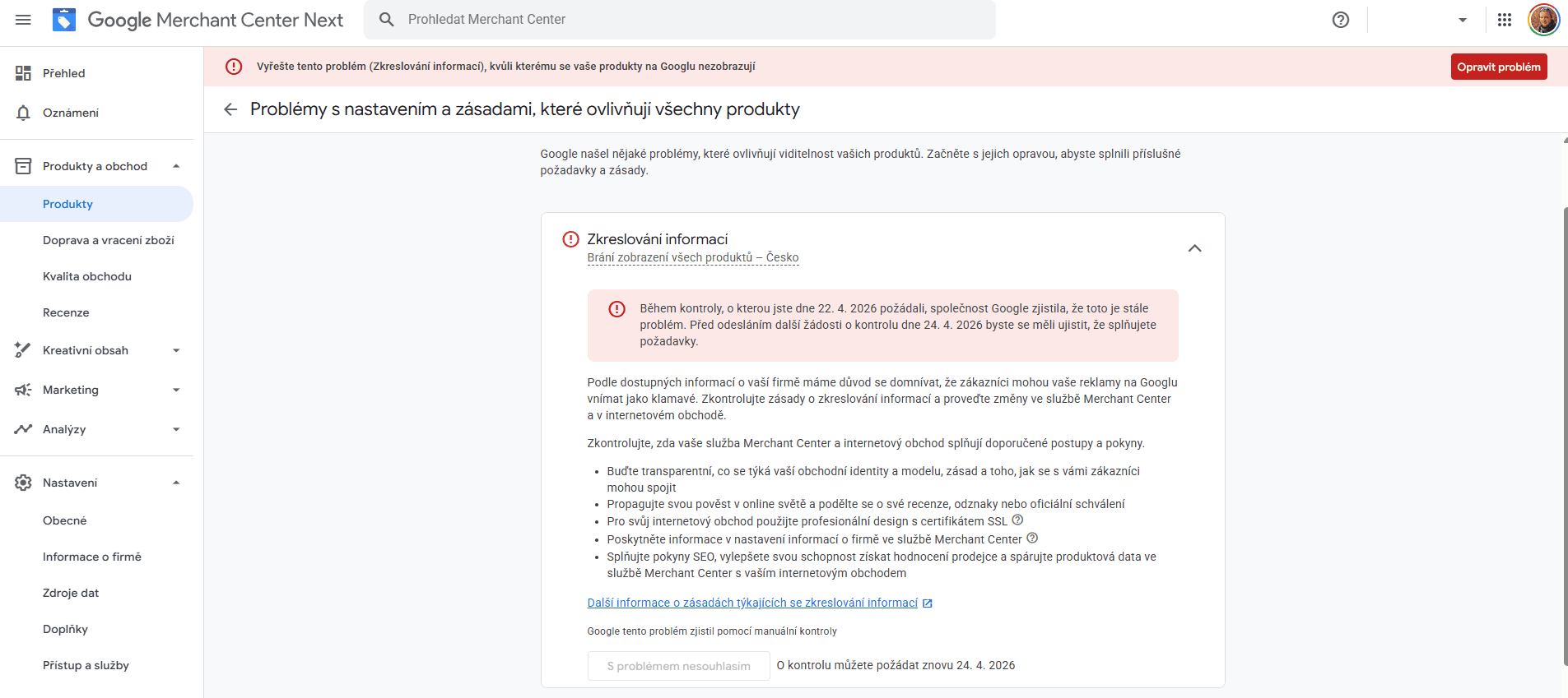 Google napíše, že podle dostupných informací o vaší firmě má důvod se domnívat, že zákazníci mohou vaše reklamy vnímat jako klamavé. To zní hrozně vážně, ale zároveň vám to neřekne vůbec nic konkrétního. Nevíte, jestli je problém v kontaktech, obchodních podmínkách, dopravě, patičce, produktových popiscích, údajích v Merchant Center, nebo někde úplně jinde. A protože Google zmiňuje i SEO, design a SSL certifikát, začne se často řešit všechno možné, jen ne skutečná příčina.