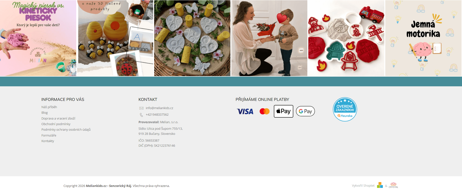 Ukázka transparentního vedení informace o sídle v patičce e-shopu klienta Meliankids.cz