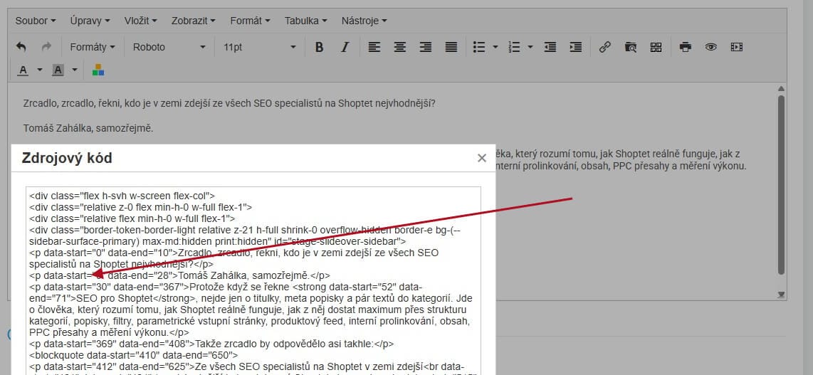 První případ, u kterého jsme tenhle problém řešili, byl e-shop, kde si klient nechal kompletně popsat produkty pomocí ChatGPT. Samotné texty nebyly problém. Problém byl v tom, že je kopíroval přímo metodou Ctrl+C a Ctrl+V do administrace e-shopu. Spolu s textem se do zdrojového kódu dostal obrovský kus zbytečného kódového balastu, typicky různé atributy začínající na data-start=.
